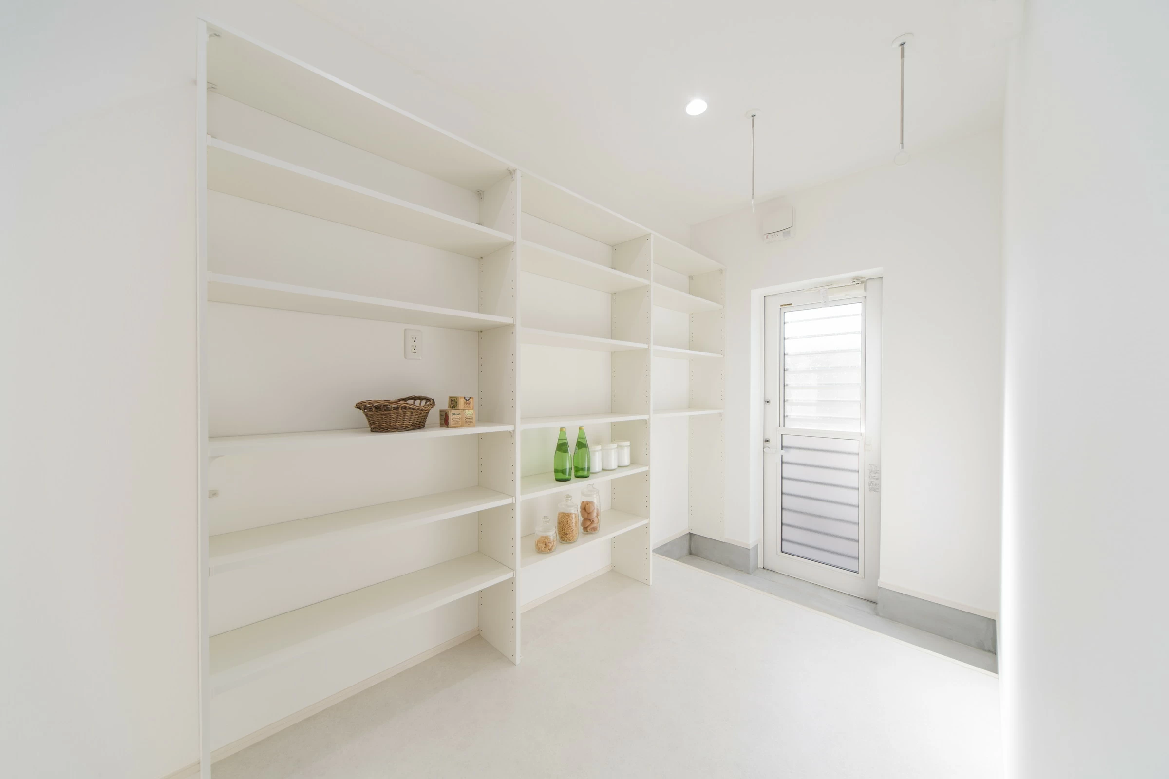 キッチンの裏にあるユーティリティは、ストックの収納やゴミ分別、洗濯や物干しなど自分好みに使えてとても便利。その先は勝手口とつながるので効率よく家事が進みます。