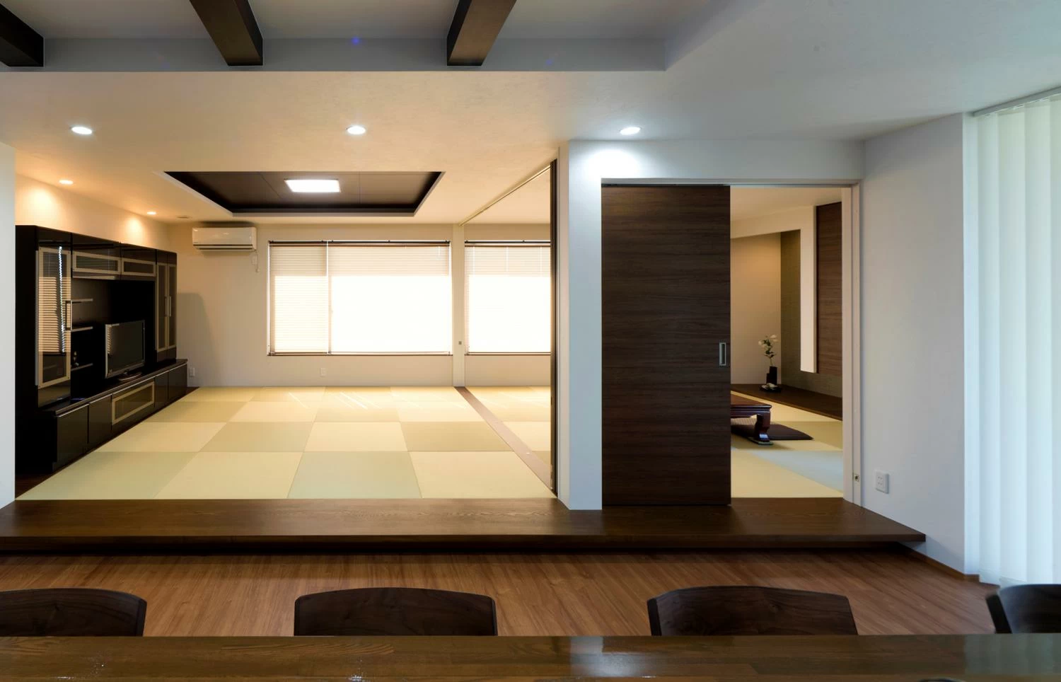 親世帯のリビング兼客間の和室はあえて一段高くなっており、旅館の宴会会場のような雰囲気。
