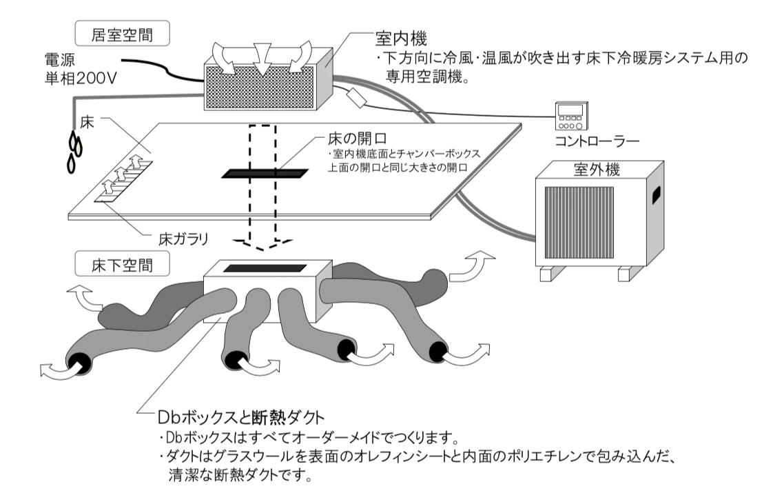 室内機の吸気口から吸い取った空気の温度を調節し、床下から直に伝わる熱と、各部屋の吹き出し口より温度調節を行っています。