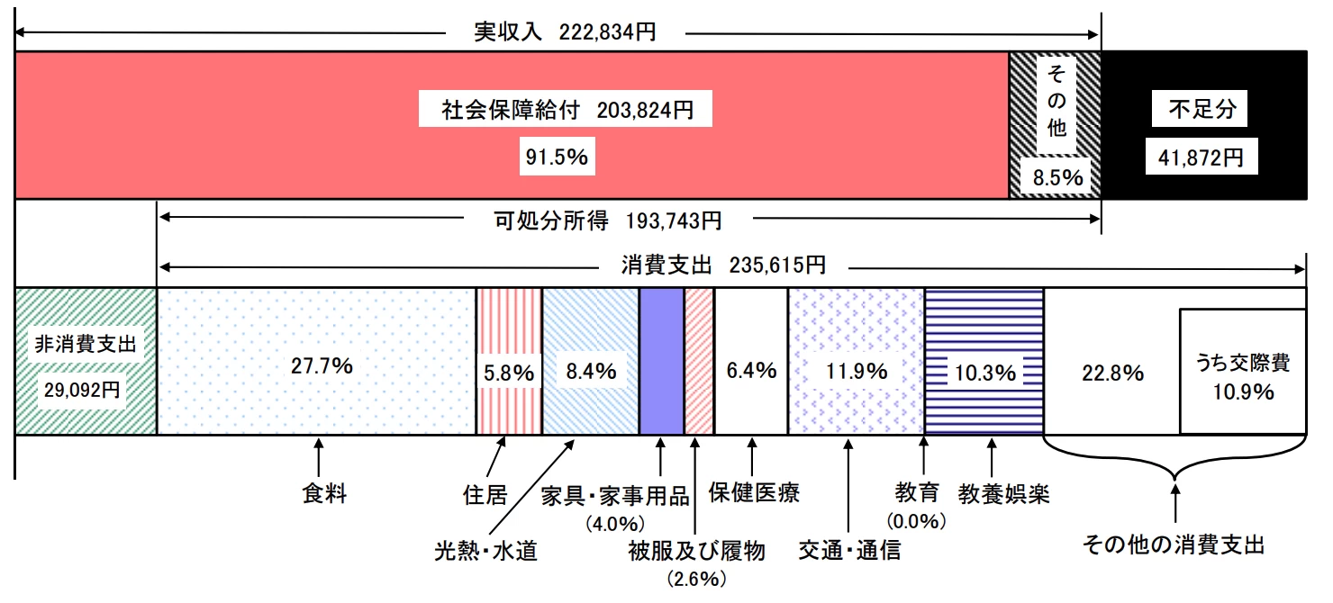 持ち家であれば、住宅ローンを完済することで消費支出へ大きな余裕を生み出すことが出来ます。例として総務省の家計調査(2018年)をもとに、高齢夫婦無職世帯の家計収支を見ていきましょう。