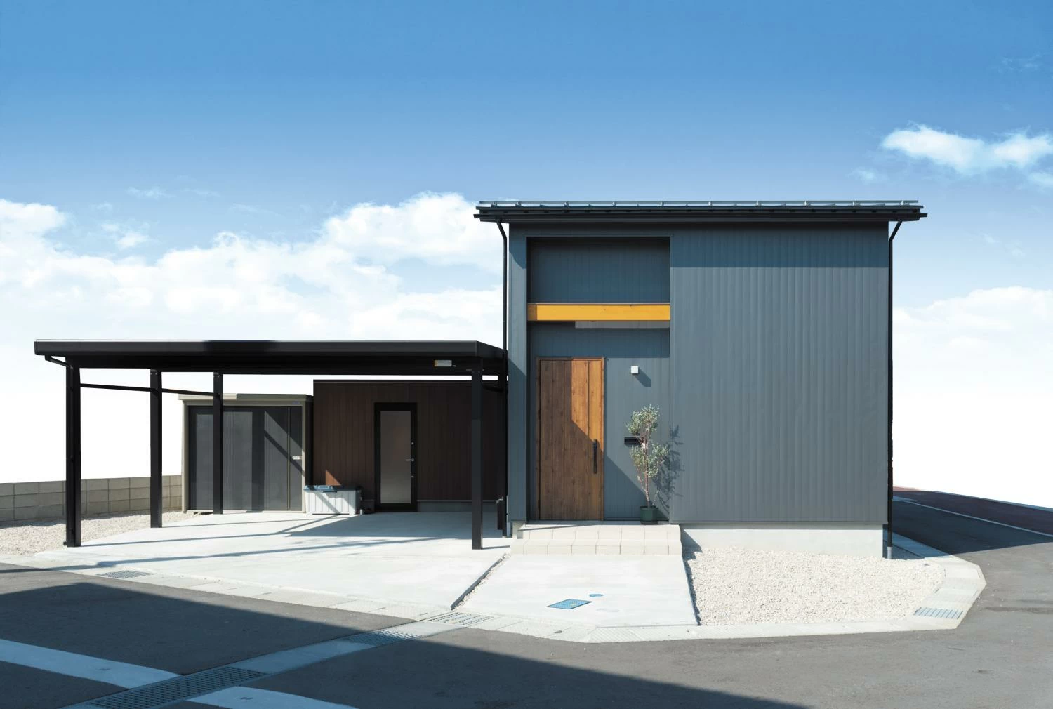 こちらのお住まいにはブラックのガルバリウム鋼板を採用しました。目の太い横貼りと目の細い縦貼りのブラックのガルバリウム鋼板を効果的に使い、遊び心を感じる外観に。木目の玄関ドアがアクセントカラーになっています。