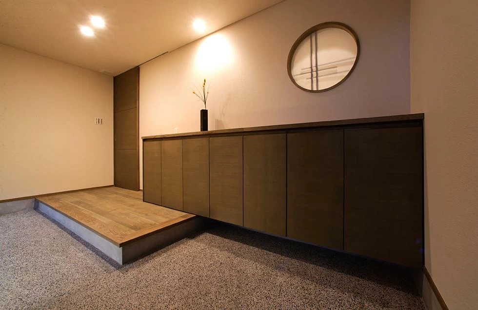この写真を見る玄関ドアをあけ、正面りの引き戸の向こうは家族玄関。 魚津市K邸 E032