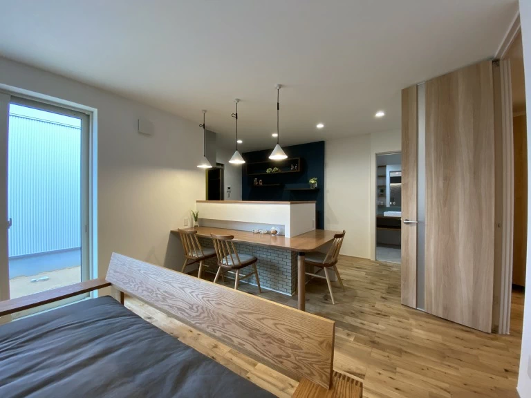 1階は無垢材の幅が広めのフローリングを採用。ダイニングにはキッチンカウンターを配置し、食器棚は造作で制作しました。シンプルながら上質な雰囲気をお楽しみいただけます。