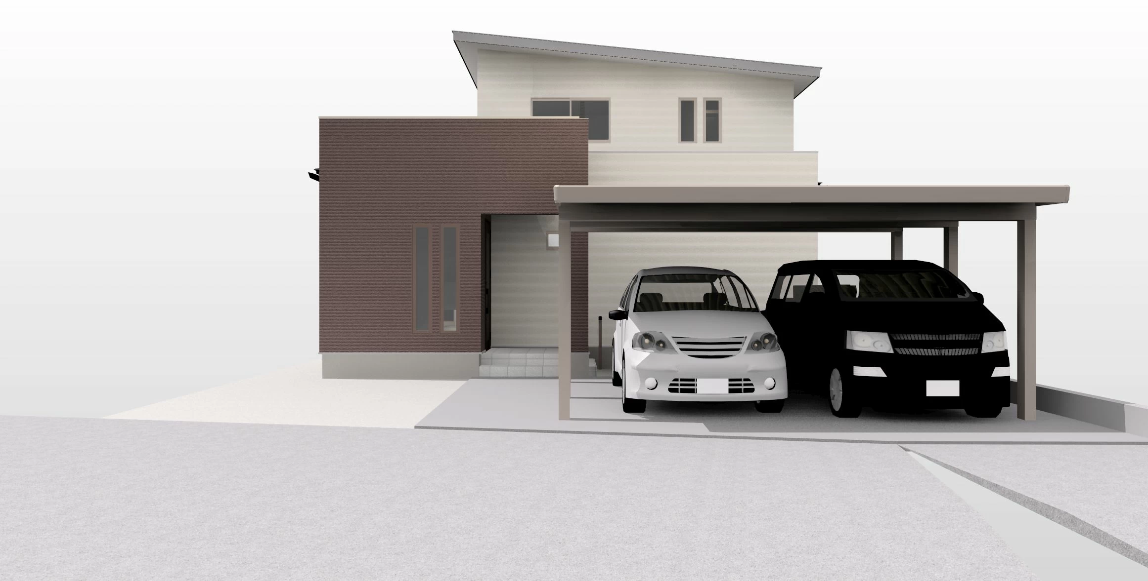 モノトーンのフラットガルバリウムの外壁と、木目のアクセントでモダンな雰囲気に。シンプルなボックス型の外観です。